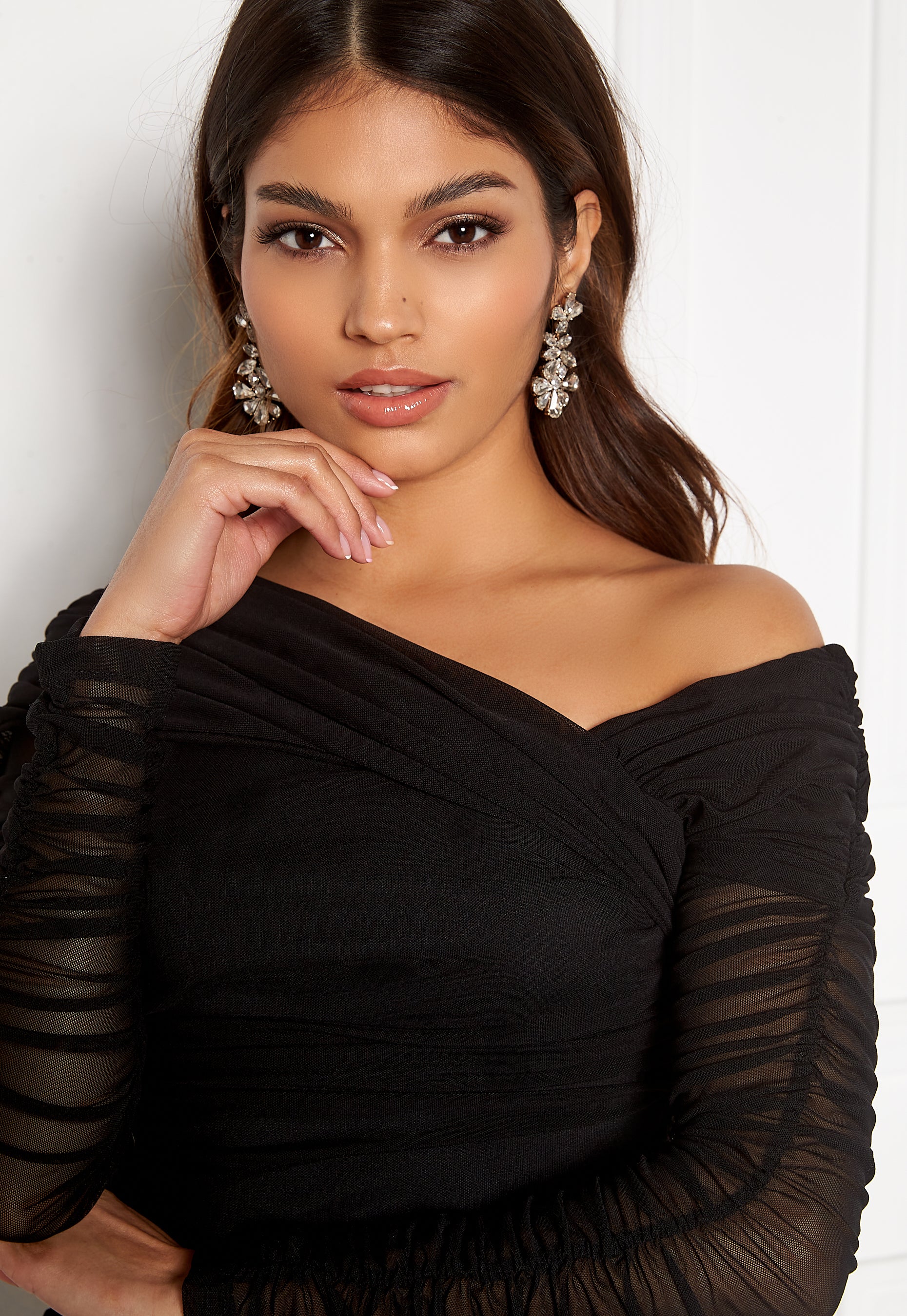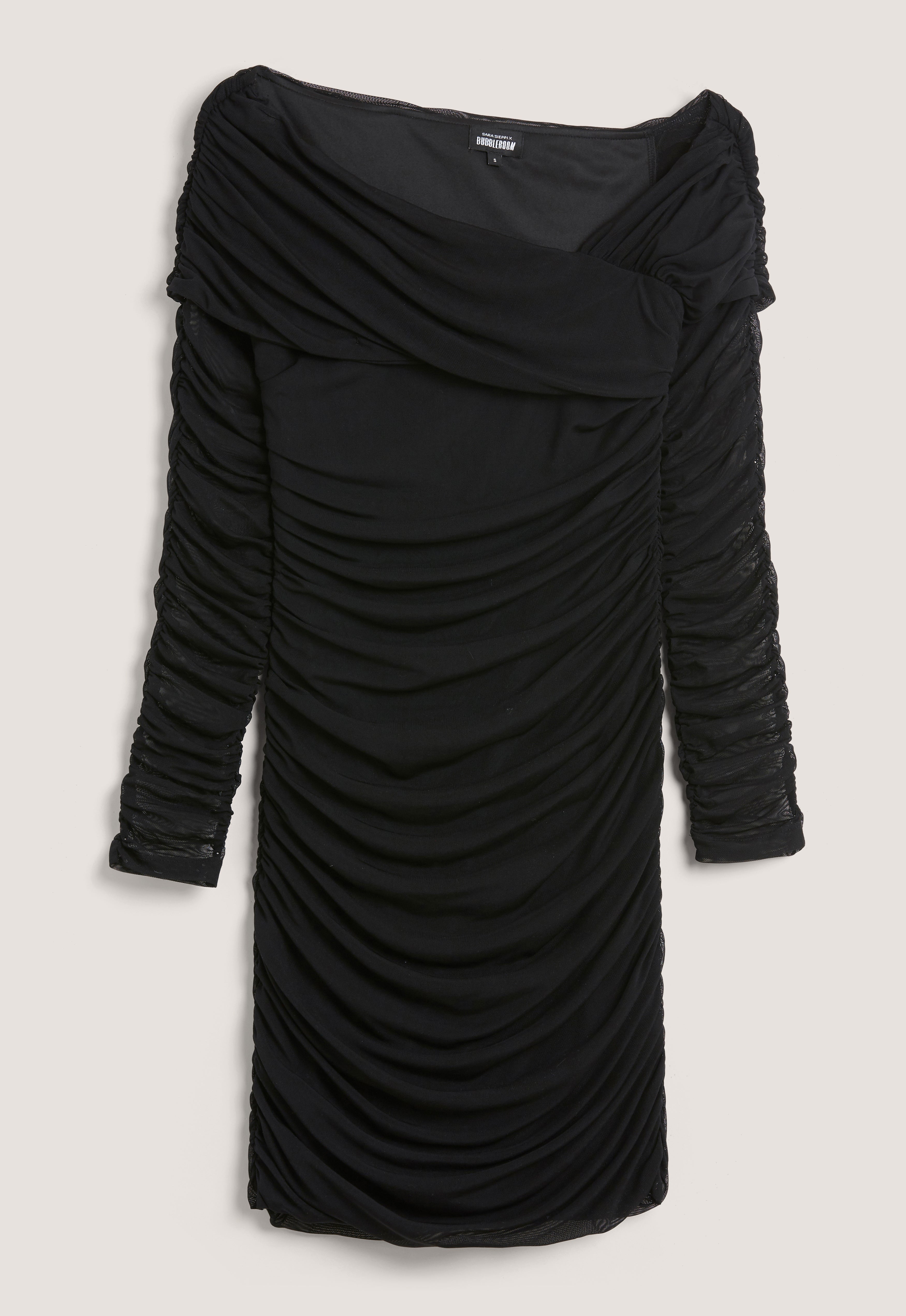 Smickrande, feminin klänning i mesh från Sara Sieppi x Bubbleroom med drapering.