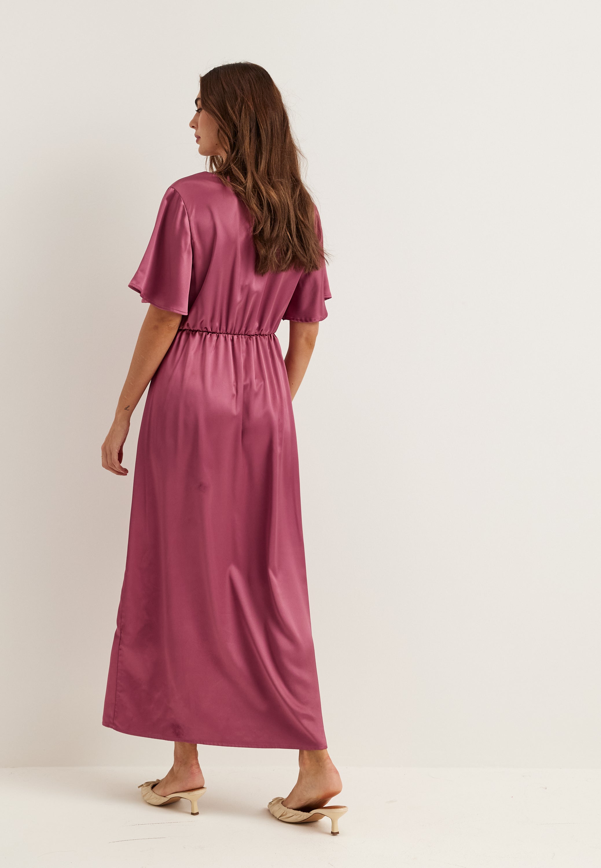 Det glansiga satintyget ger precis rätt känsla för festligare tillfällen, medan resåren baktill gör den bekväm och ger en fin passform i midjan. Knappdetaljer framtill tillför form och det lilla extra, och hellängden på 135 cm från axeln i storlek 36 ger den där långa, rena silhuetten som passar lika fint med klackar som med enkla flats.