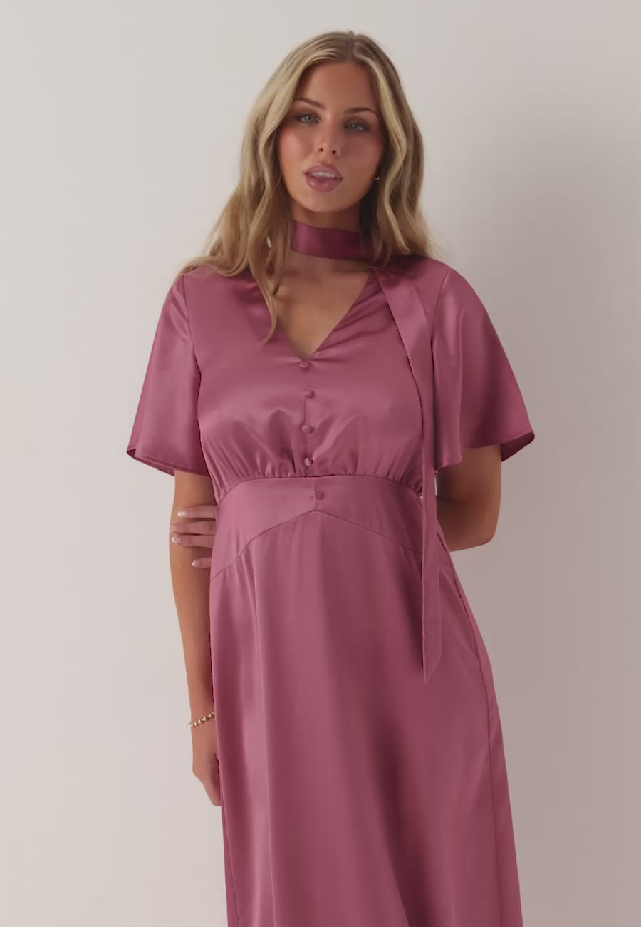 Den här maxiklänningen i satin är ett enkelt val till bröllop, sommarfester och uppklädda middagar. Den har en slät vävd finish, V-ringning och en matchande scarf som ger en mer stylad och iögonfallande look. Den figurnära passformen följer kroppen upptill innan den faller ut i en klockad kjol, så den känns smickrande utan att tappa sitt mjuka, följsamma fall.