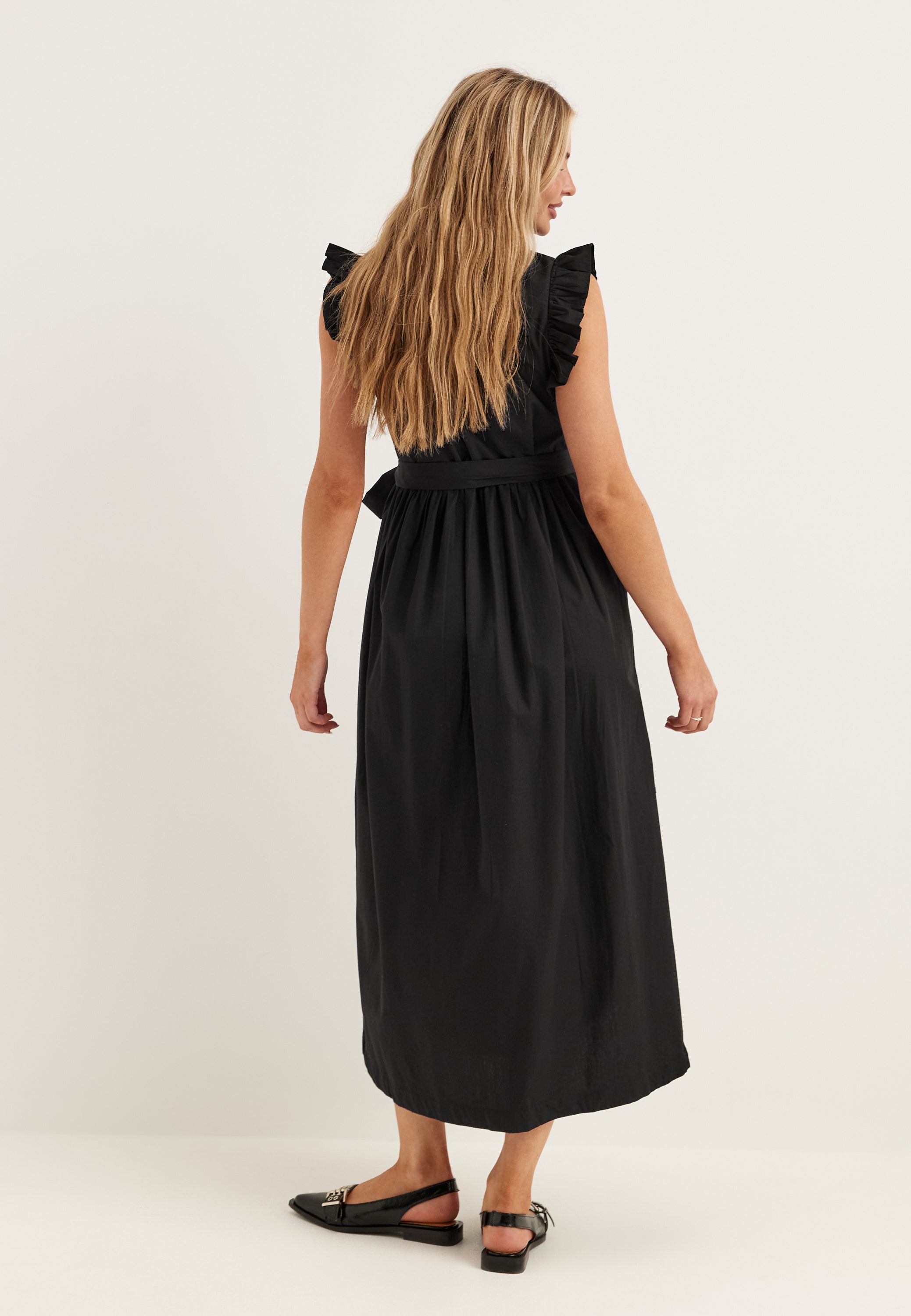 Den här svarta midiklänningen är en enkel sommarklänning för varje dag, med mjuka volangärmar, markerad midja och en vid kjol som faller fint från dagens planer till middag ute. Det vävda tyget utan stretch ger en ren och lite mer uppklädd känsla, medan den runda halsringningen med en diskret V-öppning håller looken enkel och smickrande.