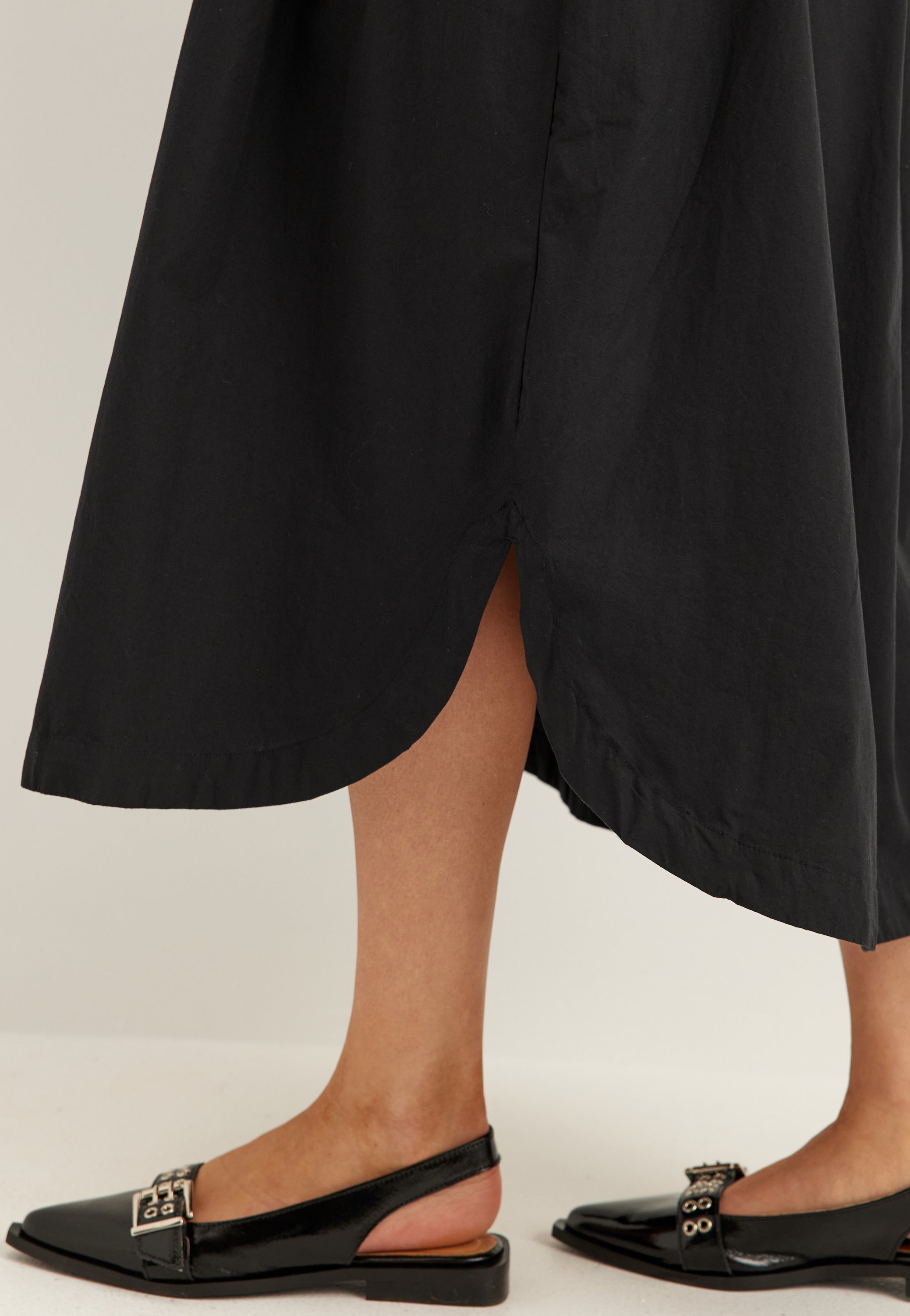 Det som gör den extra fin är balansen mellan snygg och praktisk: det avtagbara knytbältet låter dig forma midjan som du vill, och fickor i sidsömmen gör den ännu skönare att bära. Den vida kjolen ger volym utan att kännas för mycket, så den funkar lika bra med ballerinaskor och sandaler som med ett lite mer dressat par skor.