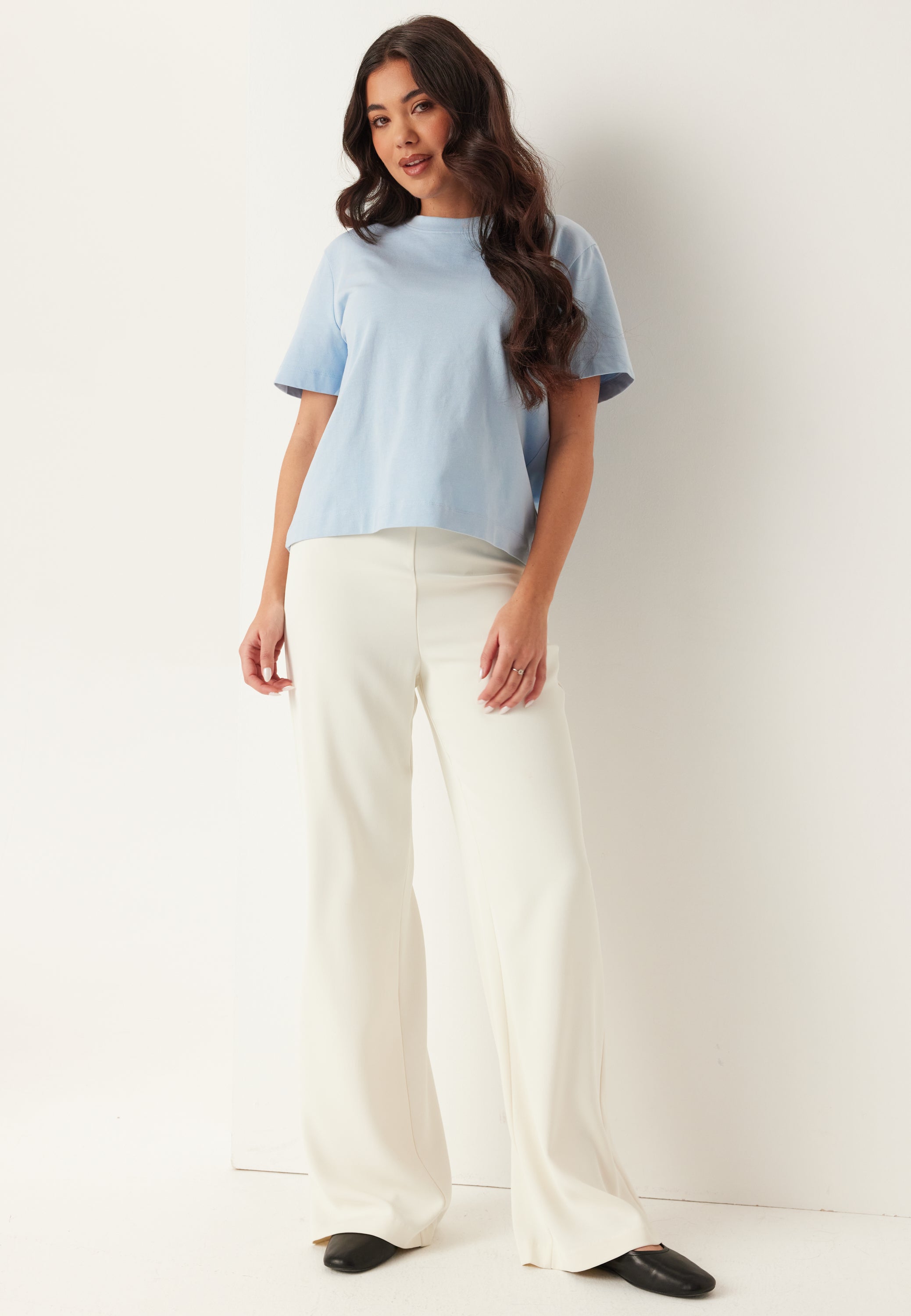 Om du vill ha en basic dam-T-shirt som känns lite mer uppklädd och användbar, är det här en sådan du kommer att plocka fram om och om igen. Den mjuka blå nyansen ger neutrala outfits ett fräscht lyft och passar extra fint med vitt, creme, denim och mjukt skräddat.