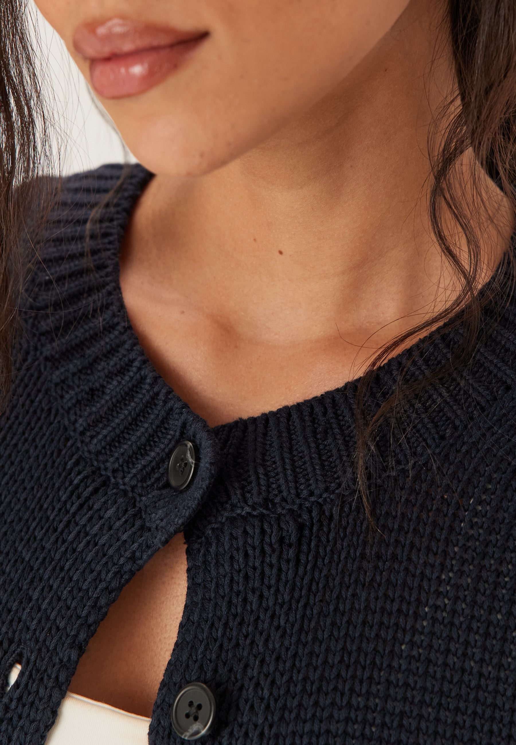 - Ribbstickad kant vid halsen, vid ärmsluten och nertill
