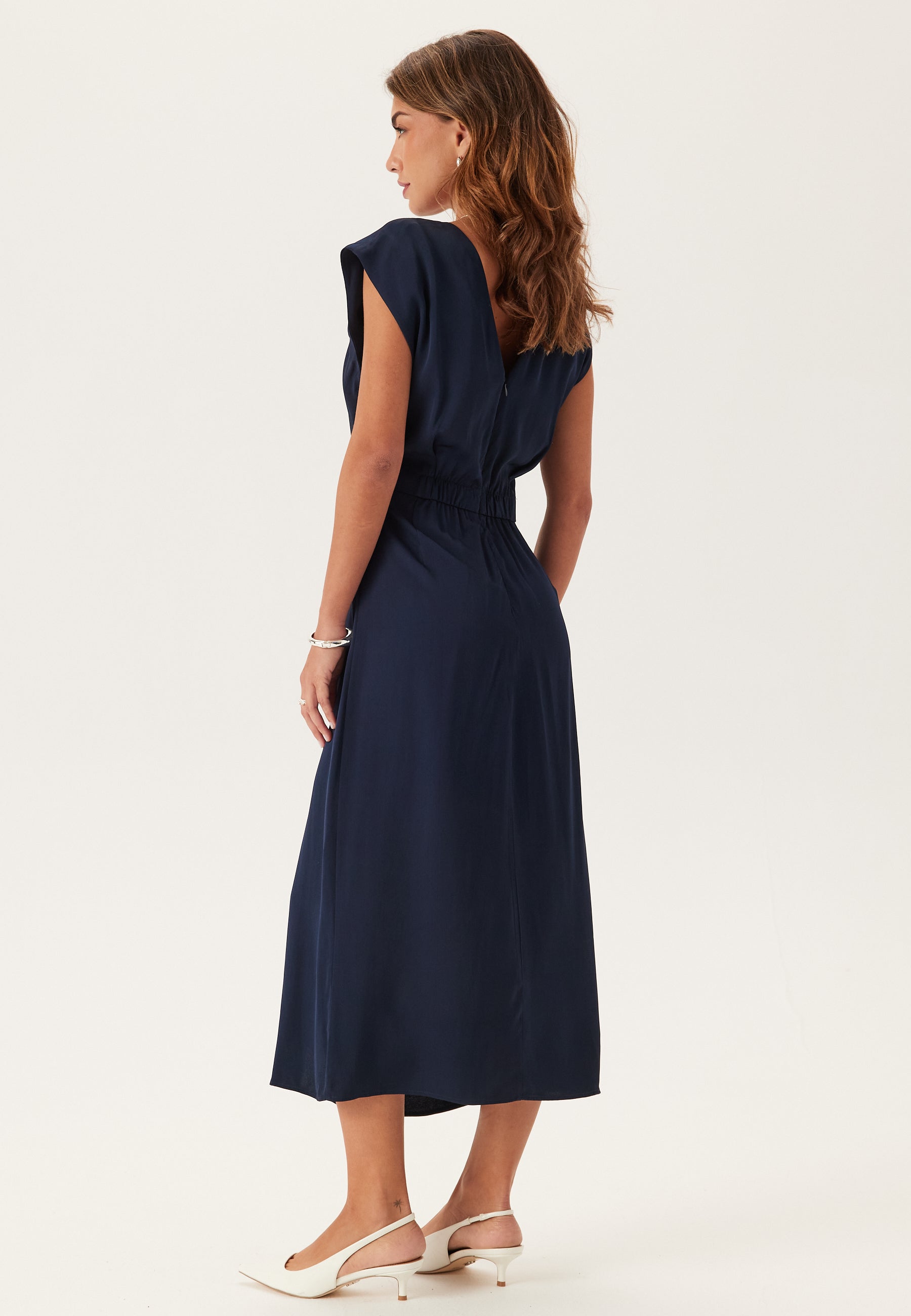 Den här midiklänningen i mörk safir är ett enkelt val från dag till middag, med en ren rund halsringning, ett smalt fall och en slits i sidan som ger lite rörelse. Den ärmlösa modellen gör den enkel och mångsidig, medan den längre längden ger ett välklätt intryck som passar till jobbet, middagar och tillfällen när du vill känna dig snygg utan att behöva tänka för mycket.
