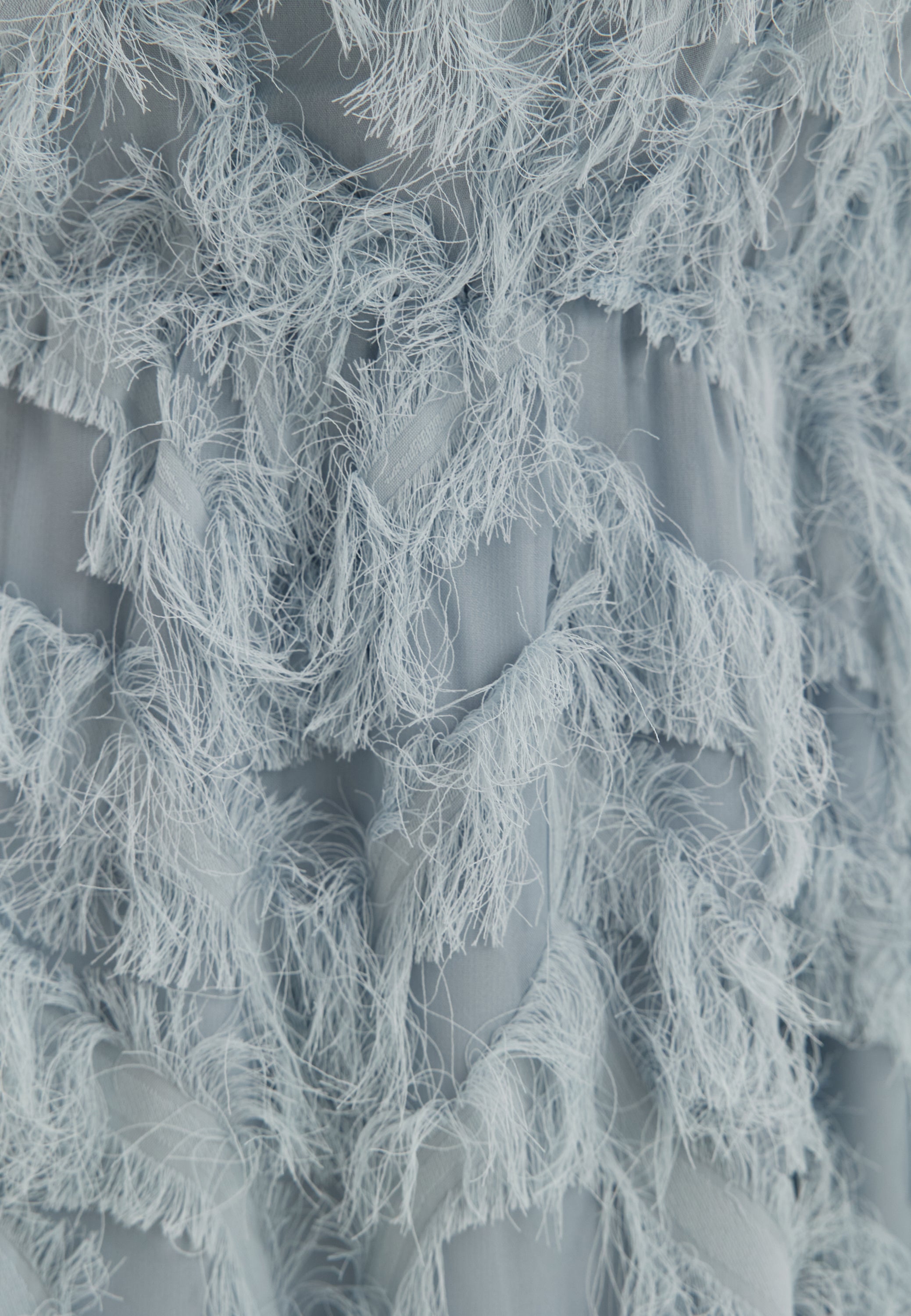 Den här dammblå midiklänningen med smala axelband är ett riktigt fint val till bröllop, fester och middagar när du vill klä upp dig. Den mjuka fransstrukturen ger klänningen fint fall, rörelse och djup. Det luftiga vävda tyget, de smala justerbara axelbanden och den enkla midilängden gör att den känns lätt och speciell utan att det blir för mycket.
