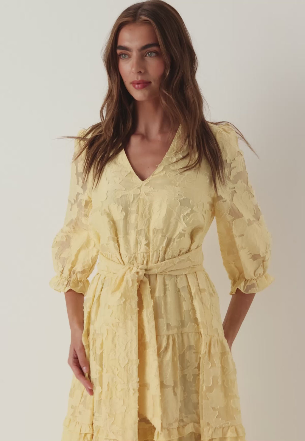 Matcha denna klänning med nudefärgade klackar eller sandaler för en förfinad ensemble som passar trädgårdsfester, bruncher eller sommarbröllop. Dess texturerade spets och mjuka gula ton skiljer den från vanliga sommarklänningar och ger en fräsch, sofistikerad charm till din garderob.