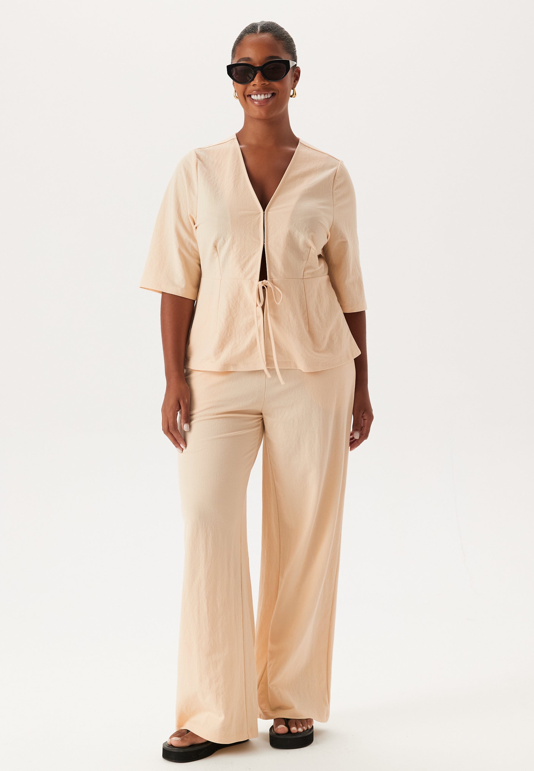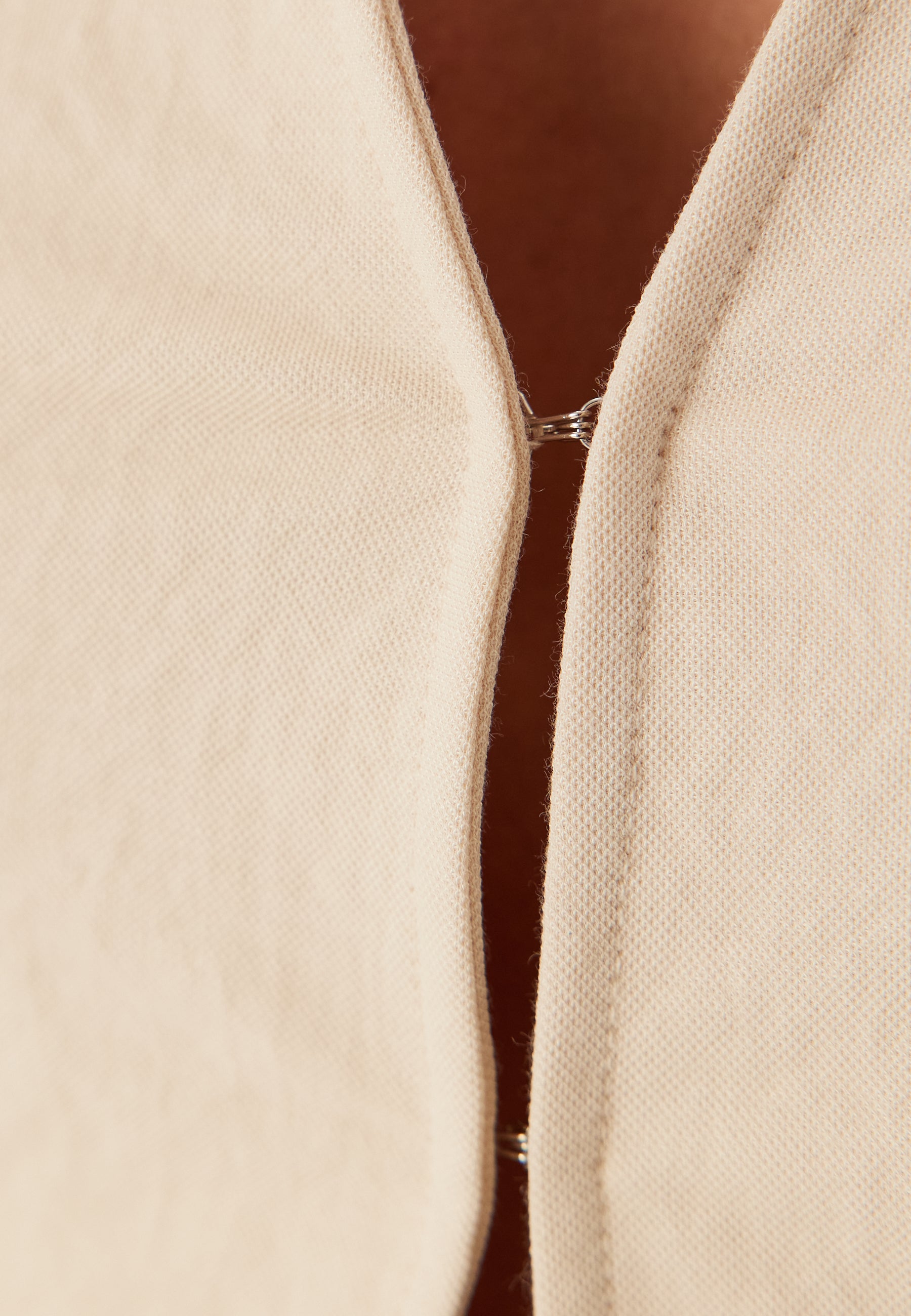 - Knäppning framtill med ett hysk- och öljettfäste och ett knytband i midjan.