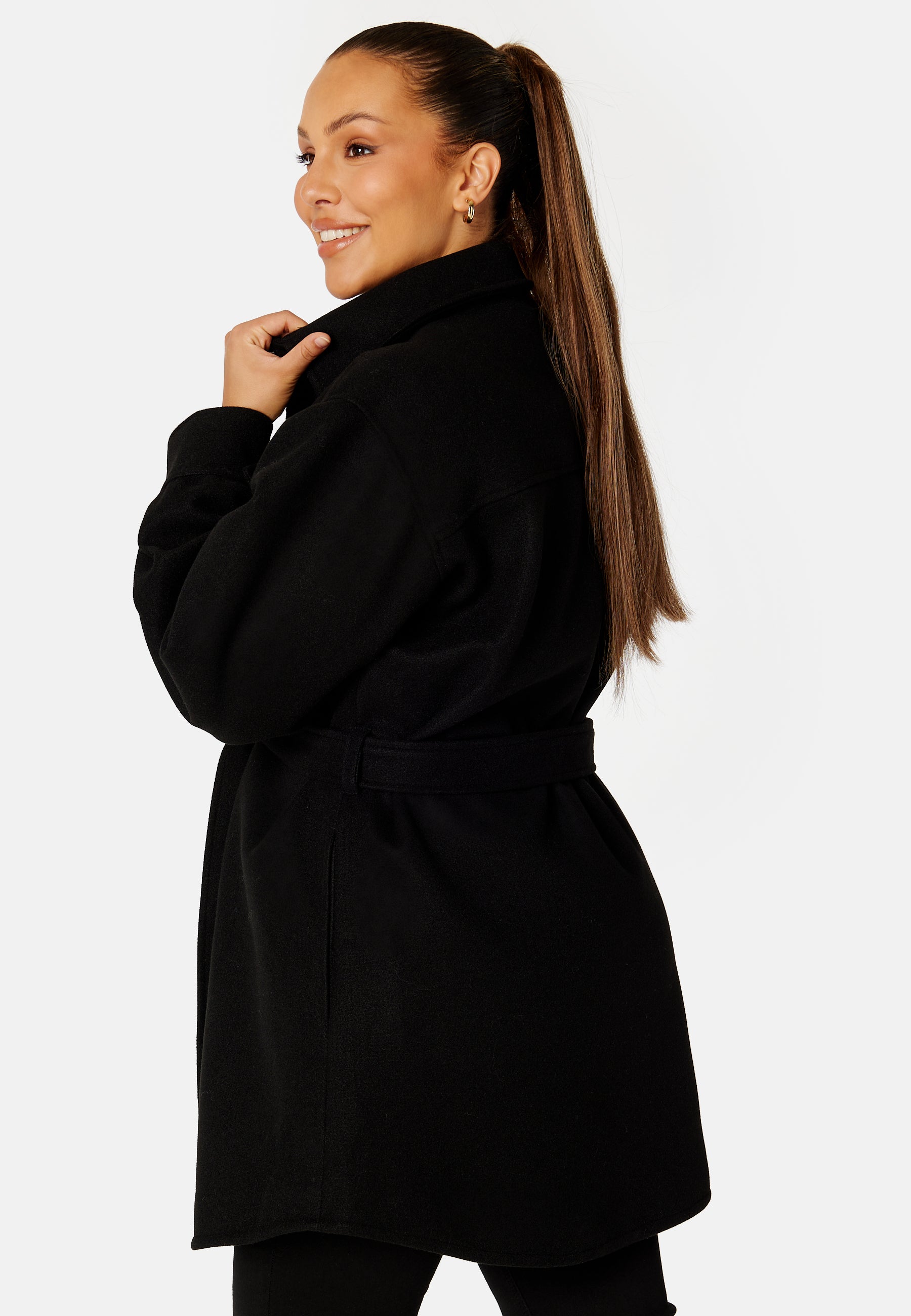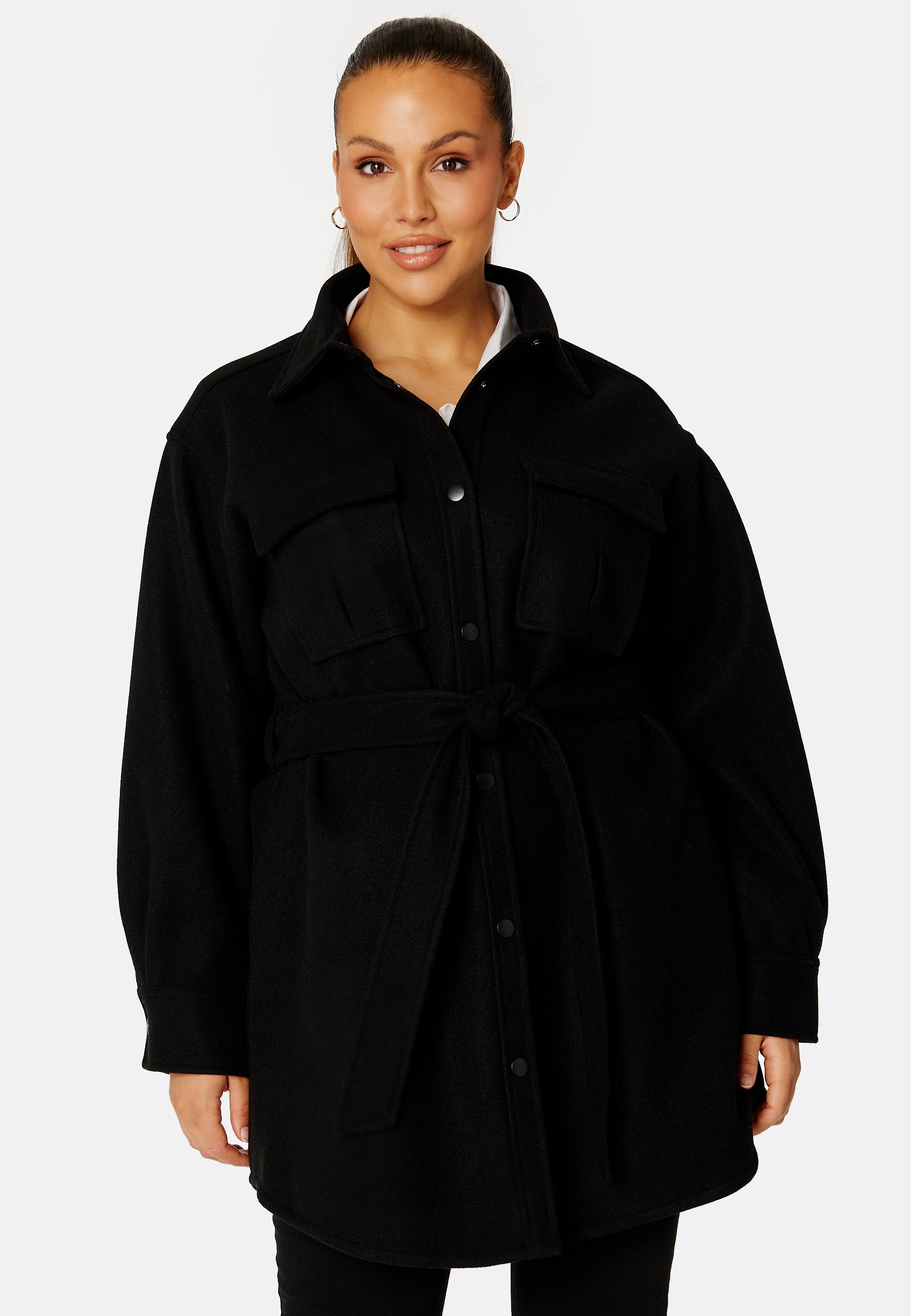 Trendy, mid-length shacket with an oversized fit and a tie band at the waist.