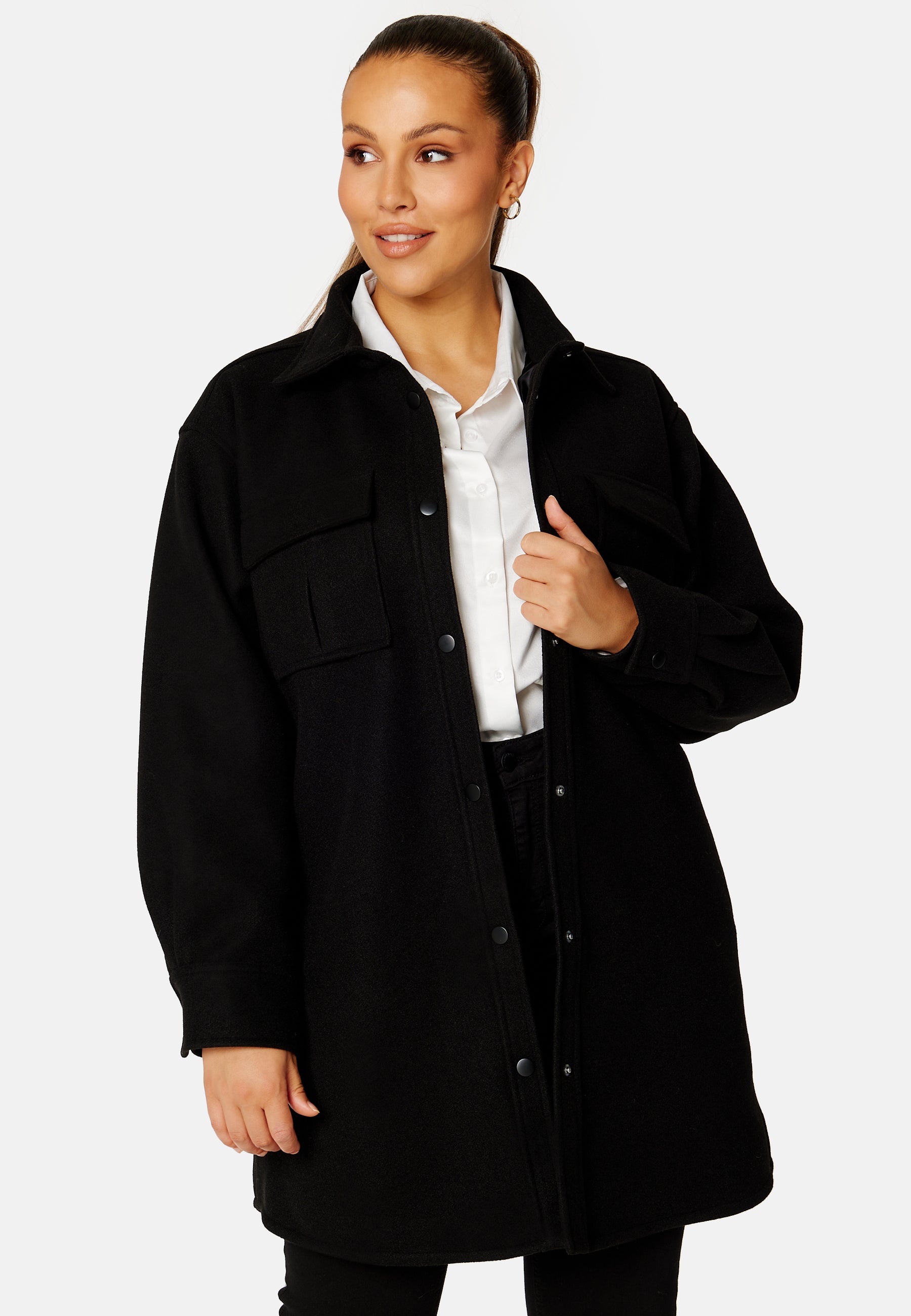 • Trendy, mid-length shacket with an oversized fit and a tie band at the waist.