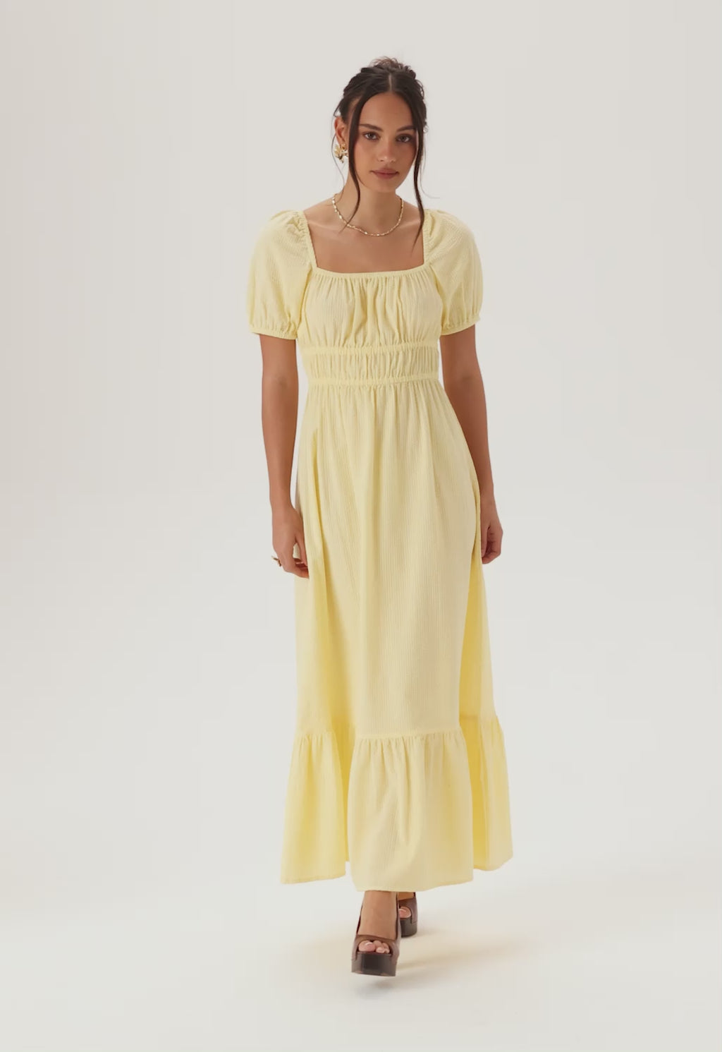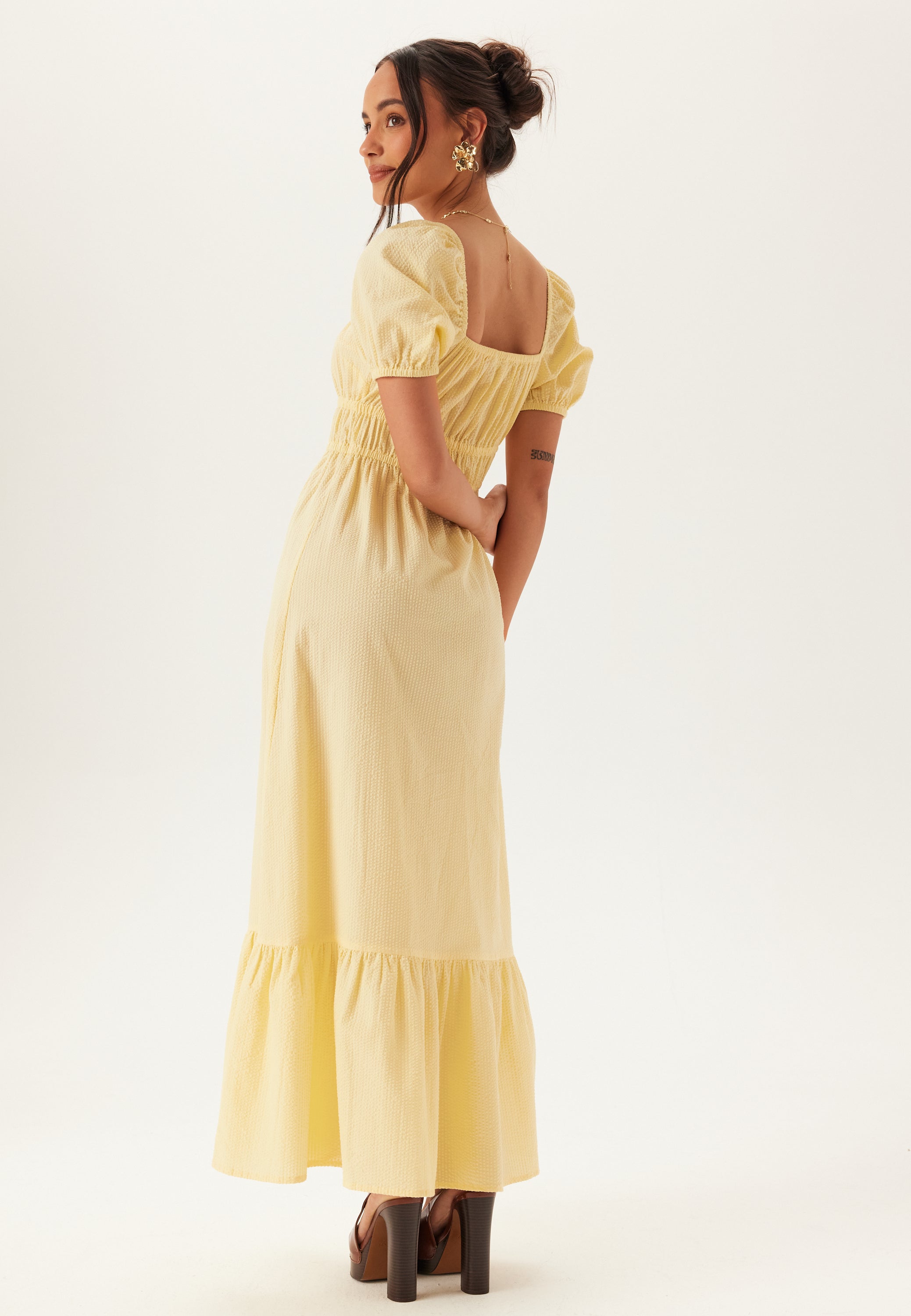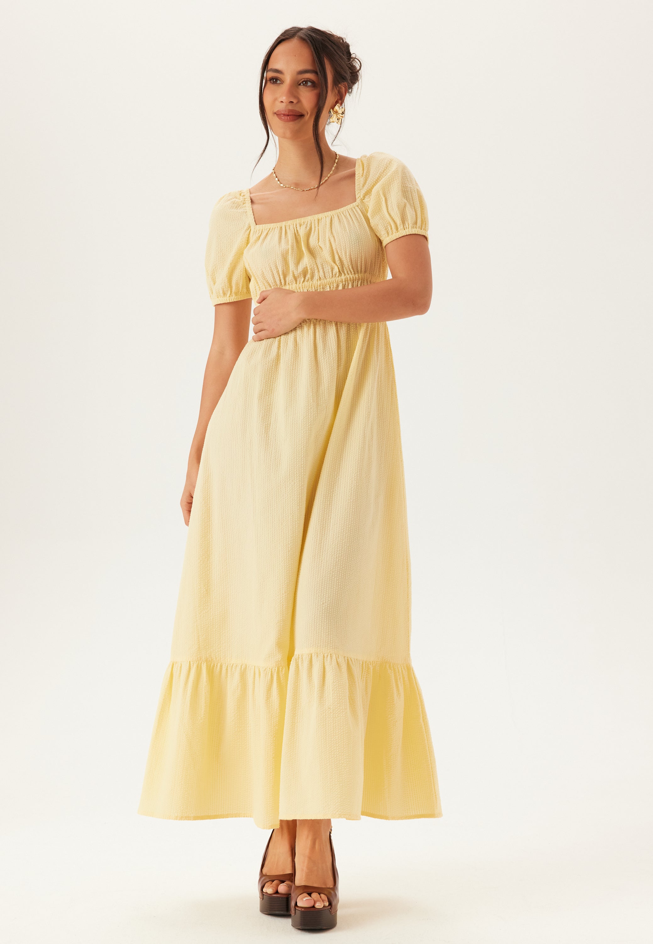 Den här maxiklänningen med fyrkantig halsringning är ett enkelt val för sommarens tillfällen – bröllop, trädgårdsfester och middagar i värmen. Den mjuka gula tonen och den hellånga silhuetten känns uppklädda utan att det blir för mycket. Den vävda bomullskvaliteten med lite struktur ger klänningen fin form, medan den markerade midjan med elastiska detaljer ger en smickrande passform som fortfarande känns bekväm hela dagen.