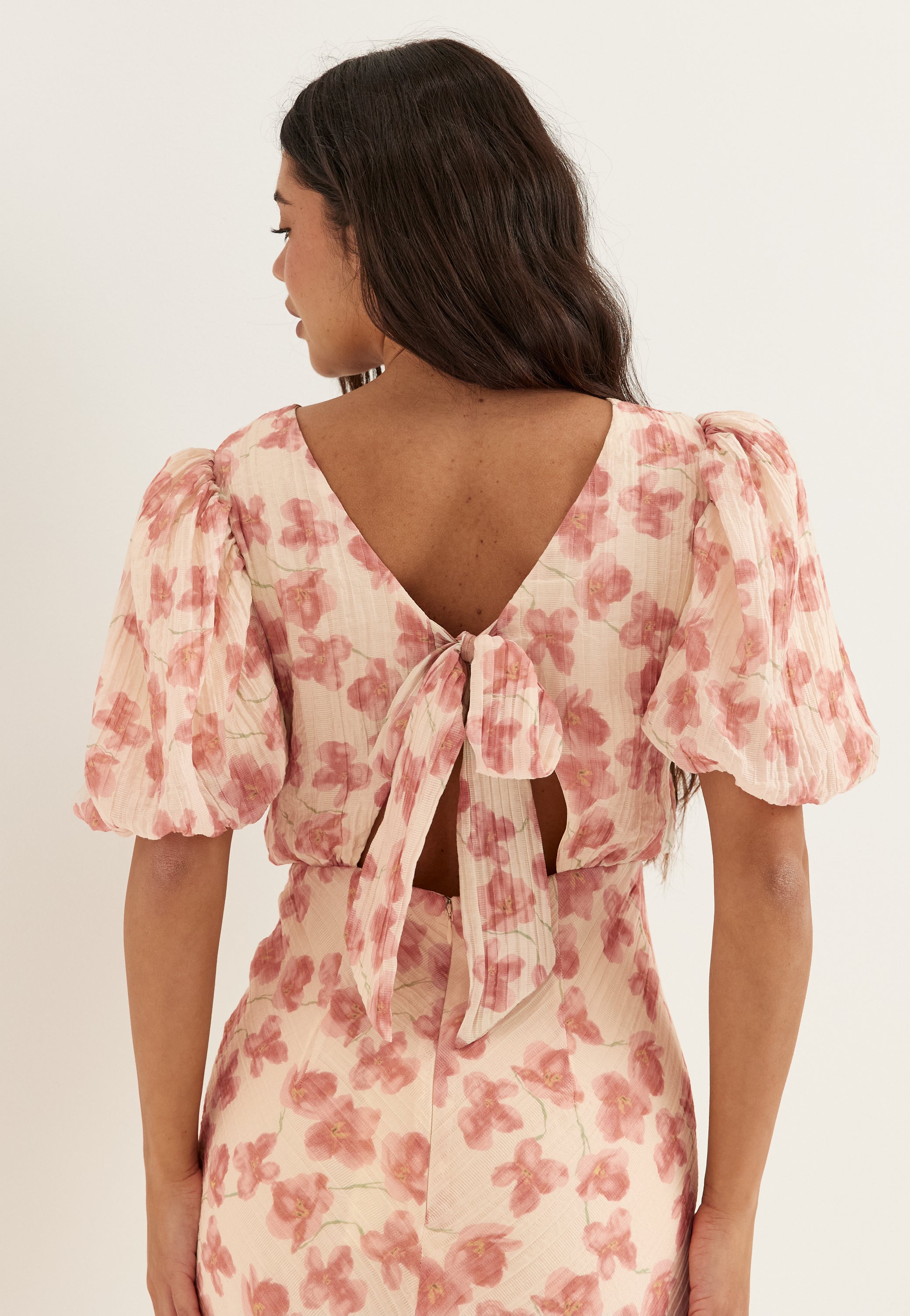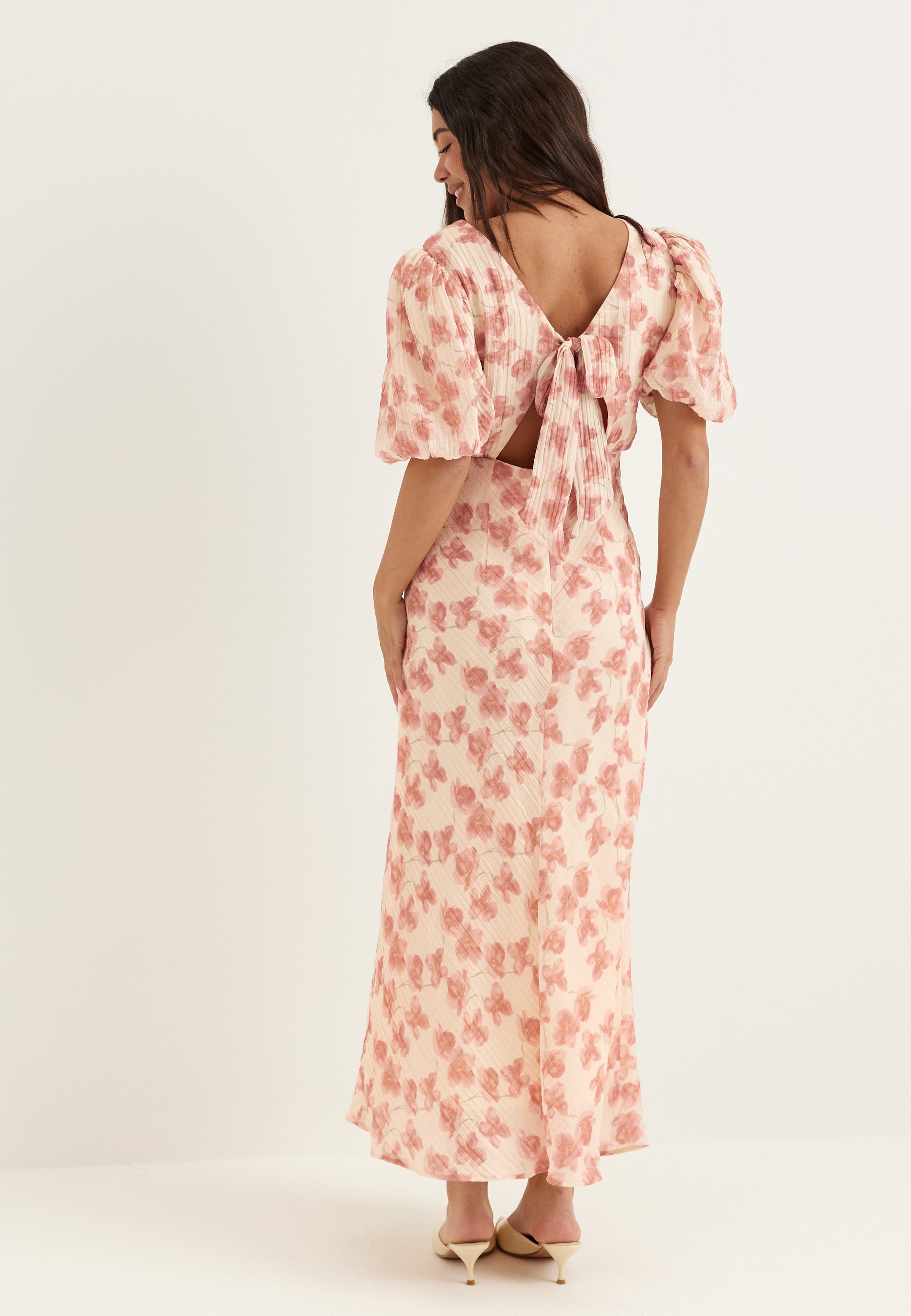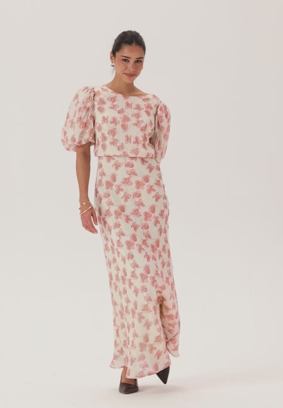 Den här blommiga midiklänningen med puffärmar är ett enkelt val för sommarfester, bröllop och middagar när du vill känna dig feminin men ändå bekväm. Det mjuka rosa mönstret och den strukturerade formen ger ett välklätt intryck, medan den längre längden gör den elegant och lätt att styla med klackar, sandaler eller en enkel clutch.