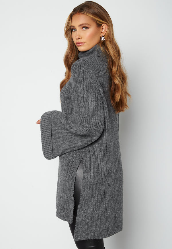 Cosy, fashionable jumper with a high slit on the side and a cosy extra long sleeve.
