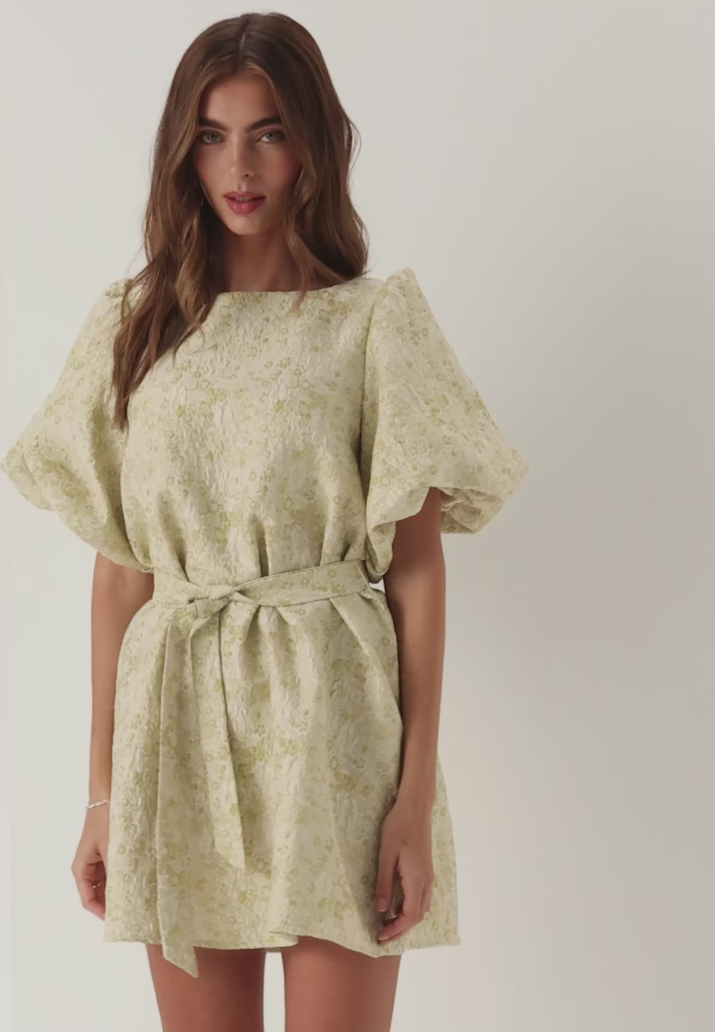 Den mjukt rundade båtringningen ger ett rent och balanserat uttryck, och de korta puffärmarna tillför en mjuk volym som gör att klänningen sticker ut från enklare miniklänningar. I det här ljusa rökgröna blommönstret känns den fräsch och lite oväntad – enkel att bära med klackar till ett event eller med flats för en mer avslappnad look.