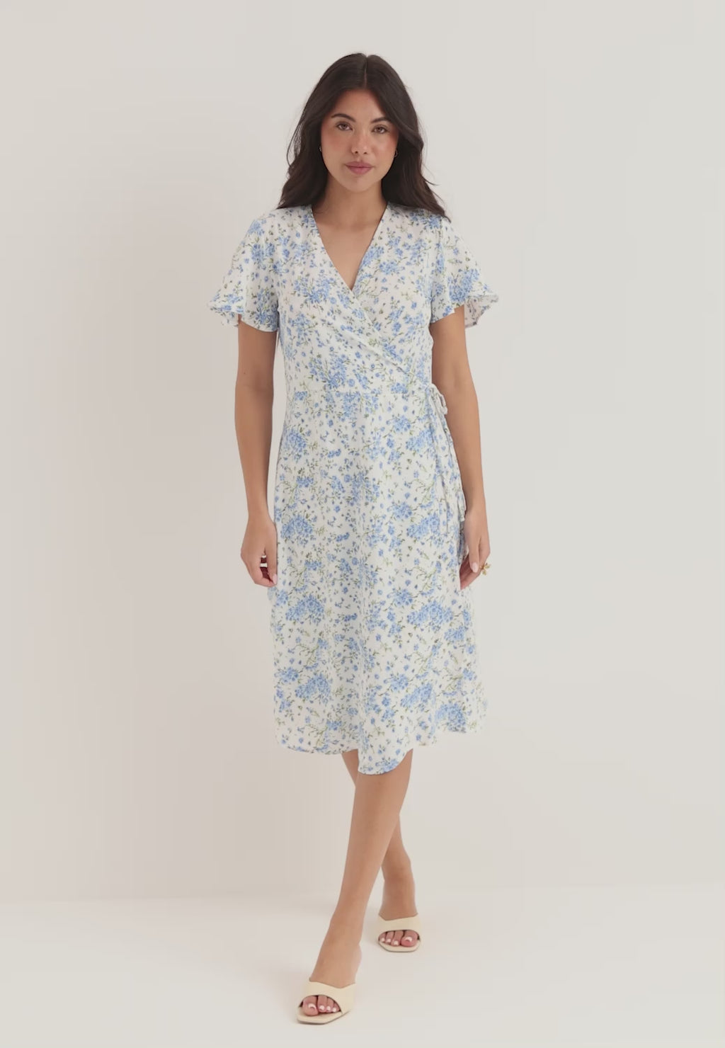 Den här blommiga omlottklänningen i midilängd är en perfekt sommarklänning för vardagen, trädgårdsfester och avslappnade middagar när du vill ha något lätt, smickrande och enkelt att styla. Det mjuka blå blommönstret mot en snövit botten ger ett fräscht och feminint uttryck, medan omlottframtill och den V-formade halsringningen skapar en silhuett som känns avslappnad men ändå välklädd.