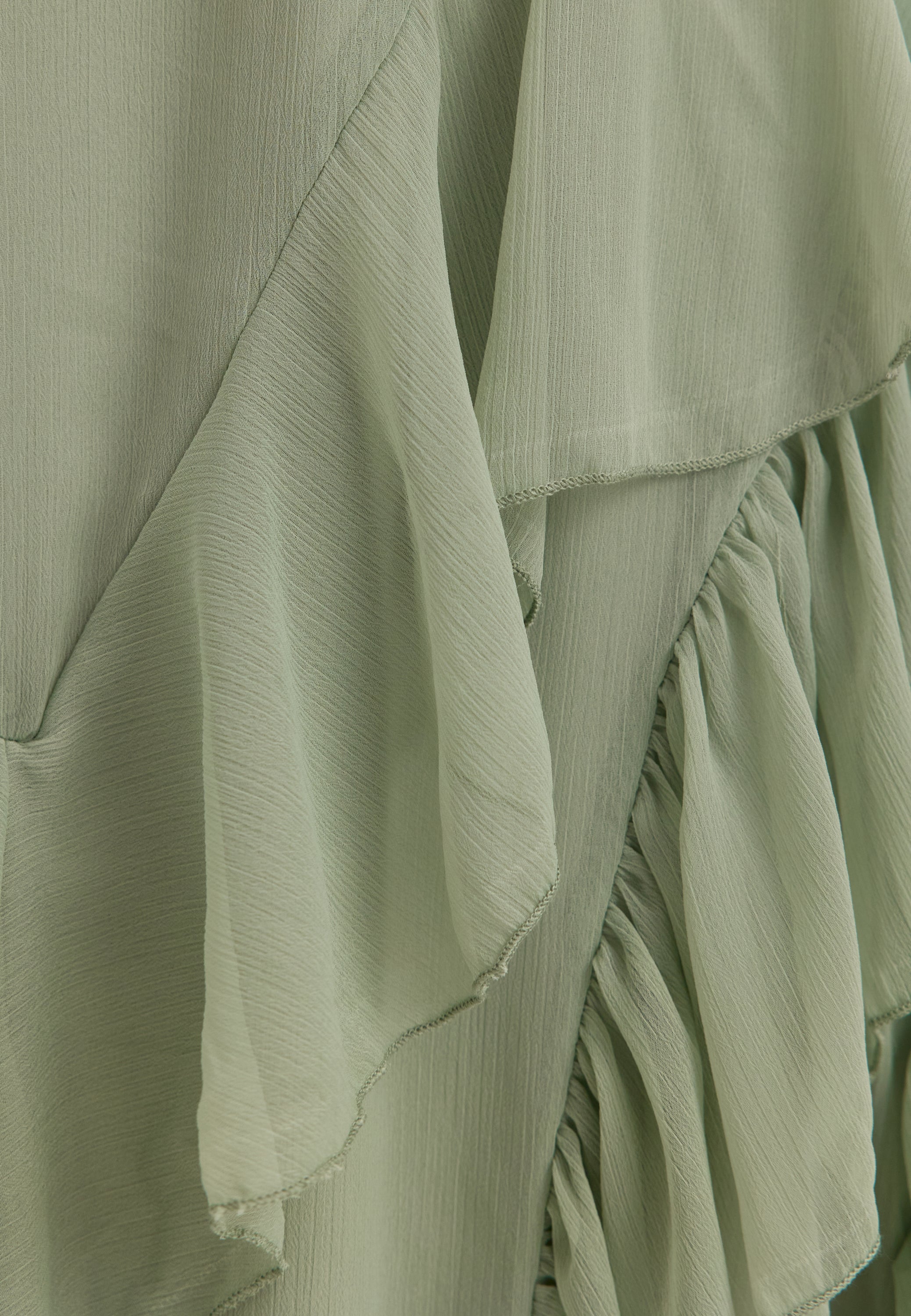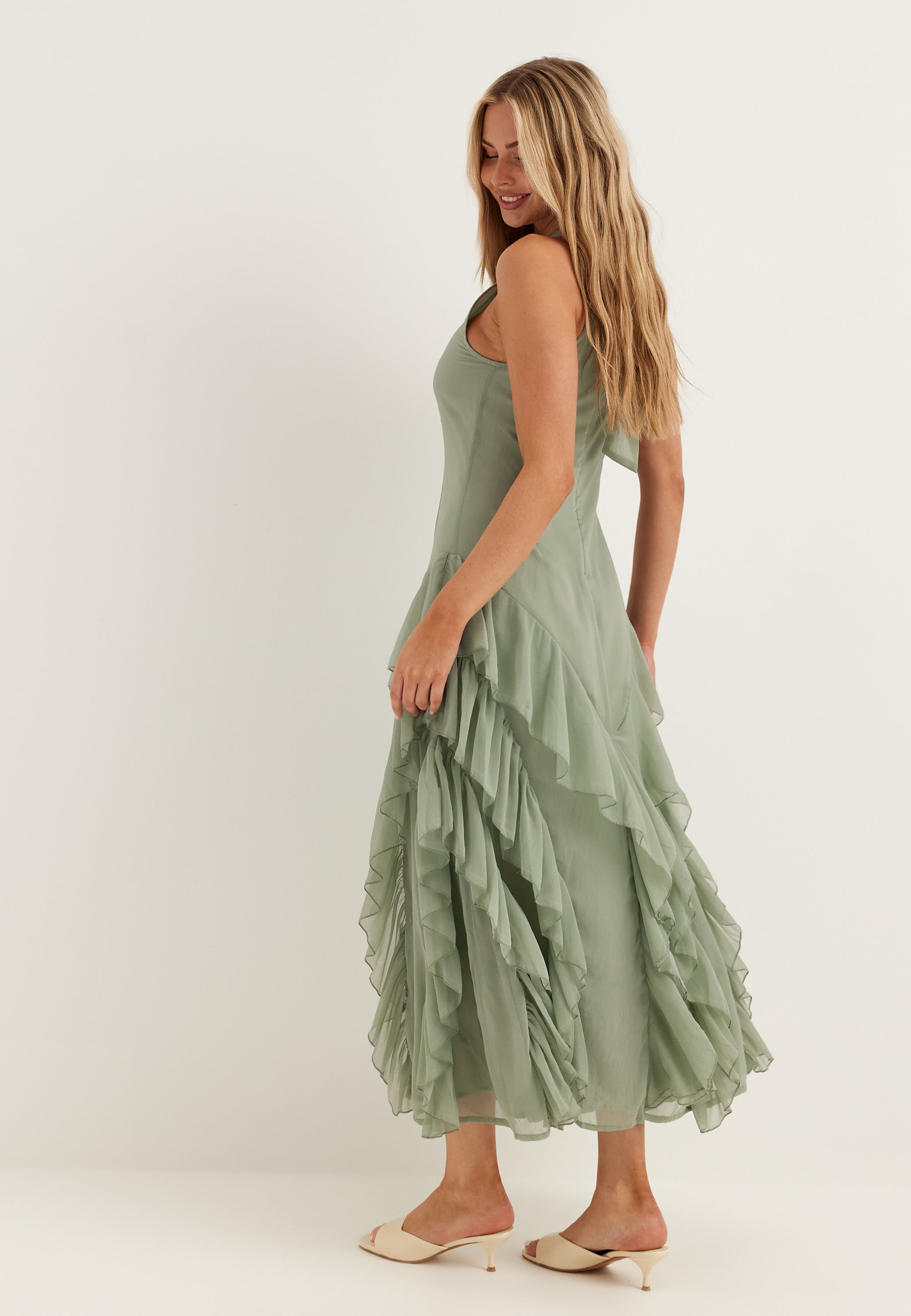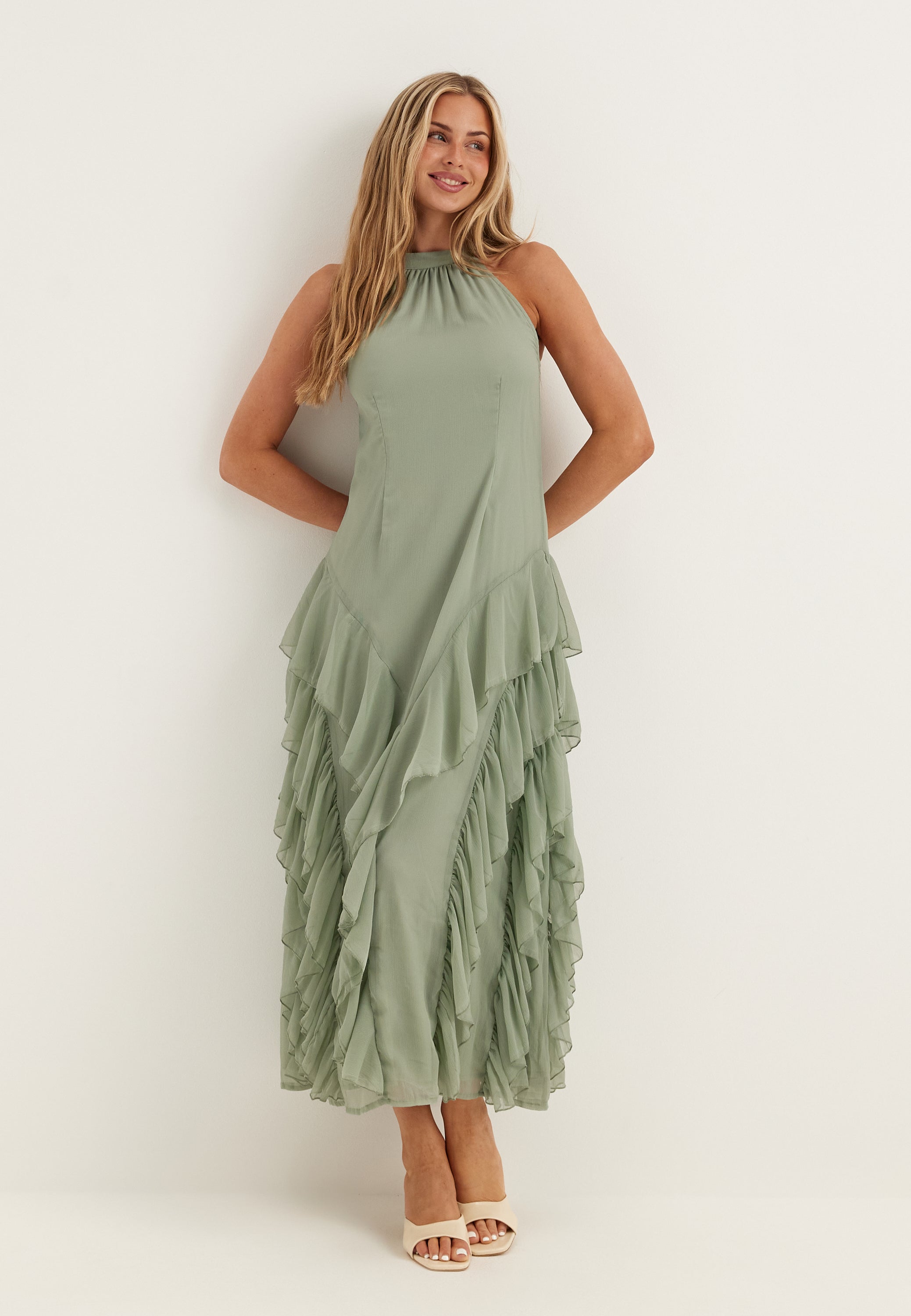 Den här gröna maxiklänningen med halterneck är ett självklart val till sommarfester, bröllop och middagar när du vill ha något lätt, smickrande och lite extra fint. Överdelen sitter nära kroppen och balanserar den vidare kjolen på ett jättefint sätt, medan de mjuka volangdetaljerna ger fin rörelse i varje steg.