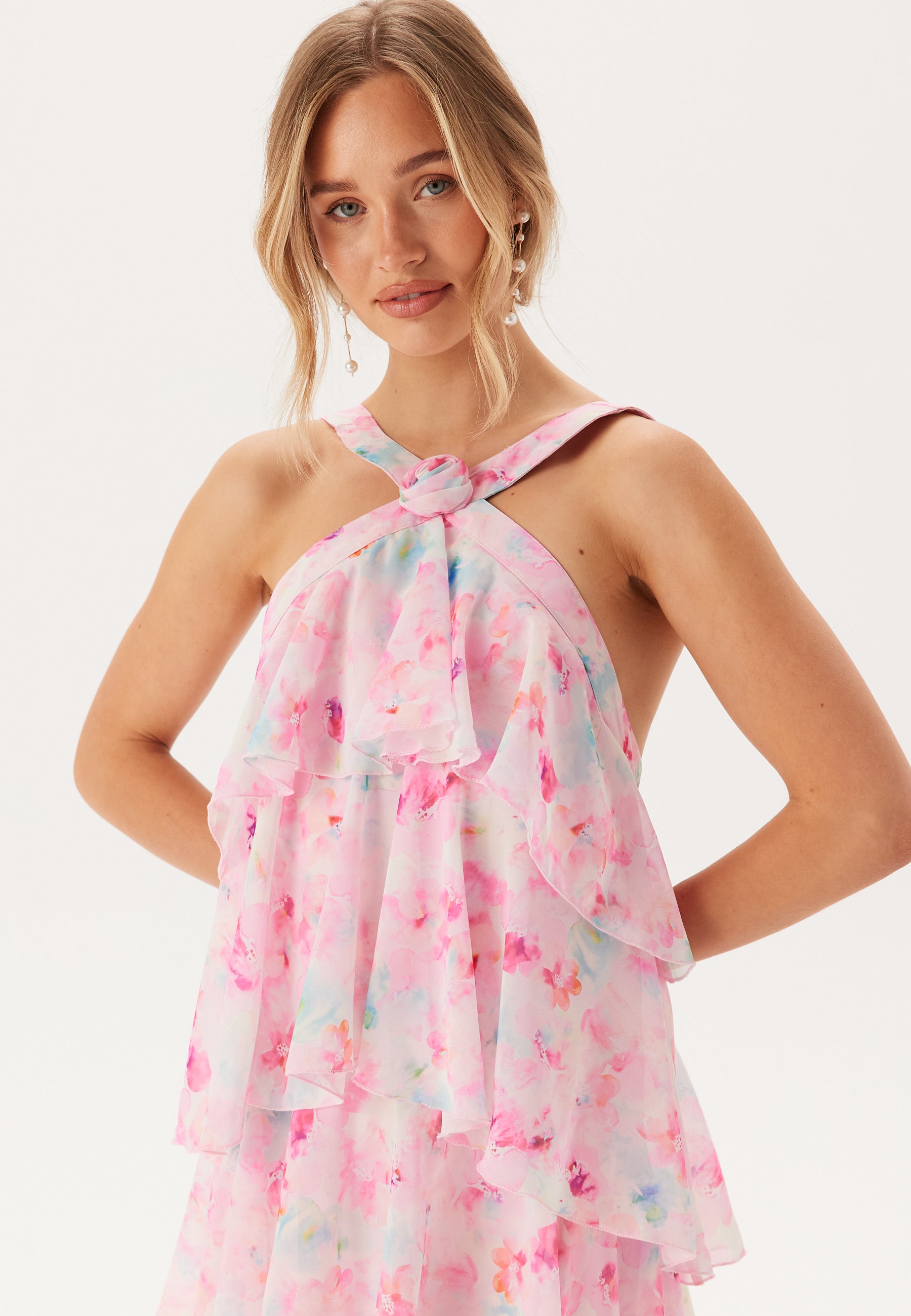 - Halterneck med en blomdetalj.