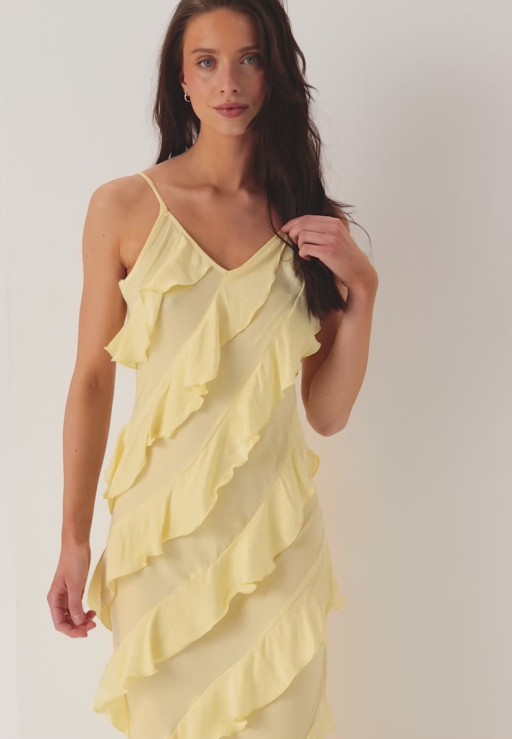 Den här gula maxiklänningen med volanger är ett enkelt val för bröllop, sommarfester och middagar på semestern när du vill ha något lätt, feminint och lite extra fint. Det mjuka vävda tyget ger en luftig känsla, medan V-ringningen och de smala axelbanden skapar en ren och smickrande silhuett.