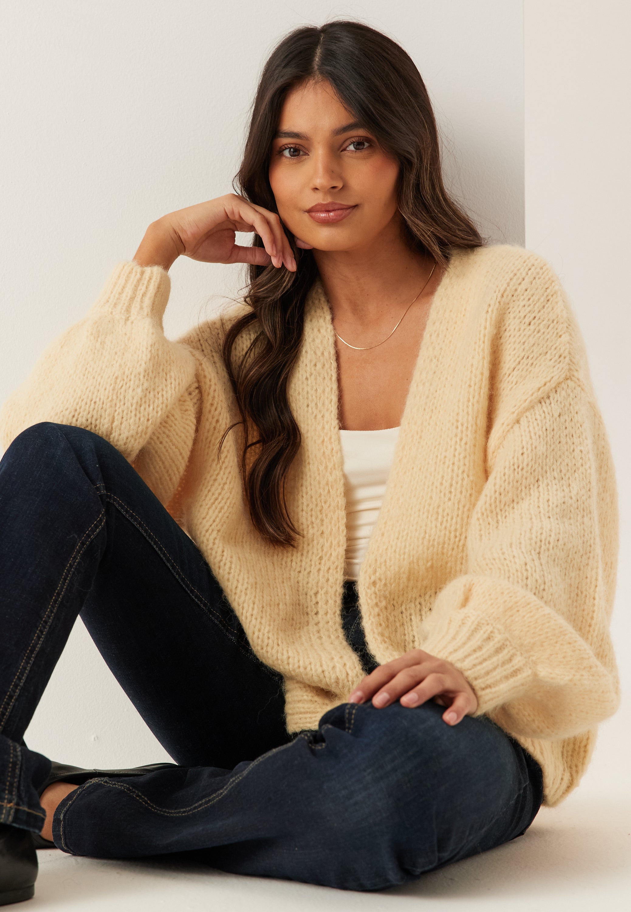 Den här stickade koftan utan knäppning är ett enkelt lager för vardagen, med en mjuk, grovstickad känsla och en avslappnad passform som är lika mysig som den ser ut. I en ljus krämfärg är den lätt att dra på över ett linne, en T-shirt eller en klänning när du vill ha lite extra värme utan att det känns bylsigt.