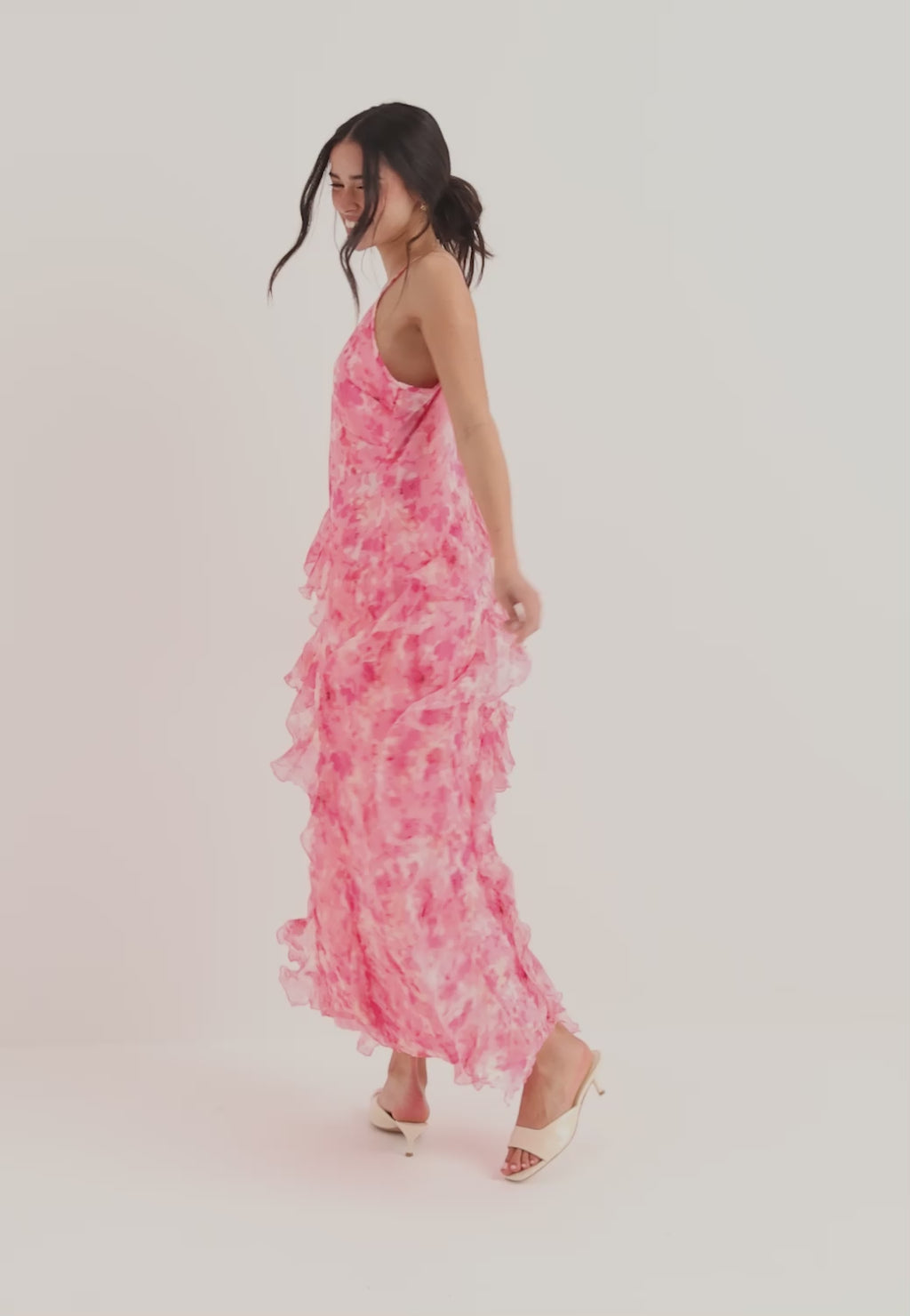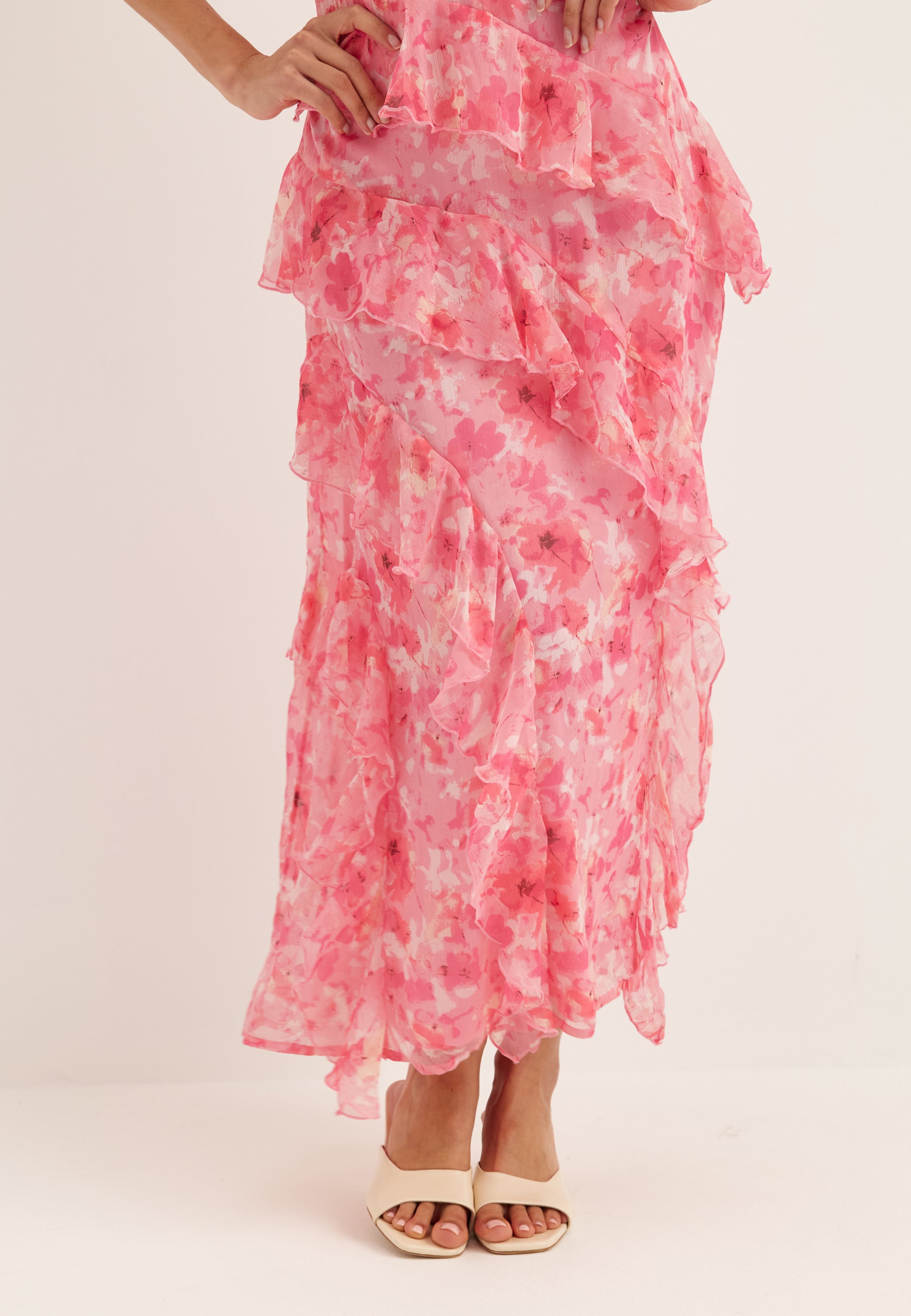 Den här rosa maxiklänningen med blommigt mönster är ett enkelt val till bröllop, sommarfester och middagar när du vill ha något lätt, feminint och lite extra fint. V-ringningen, de smala justerbara axelbanden och de mjuka volangdetaljerna ger ett luftigt fall, medan den långa längden gör looken mer uppklädd.