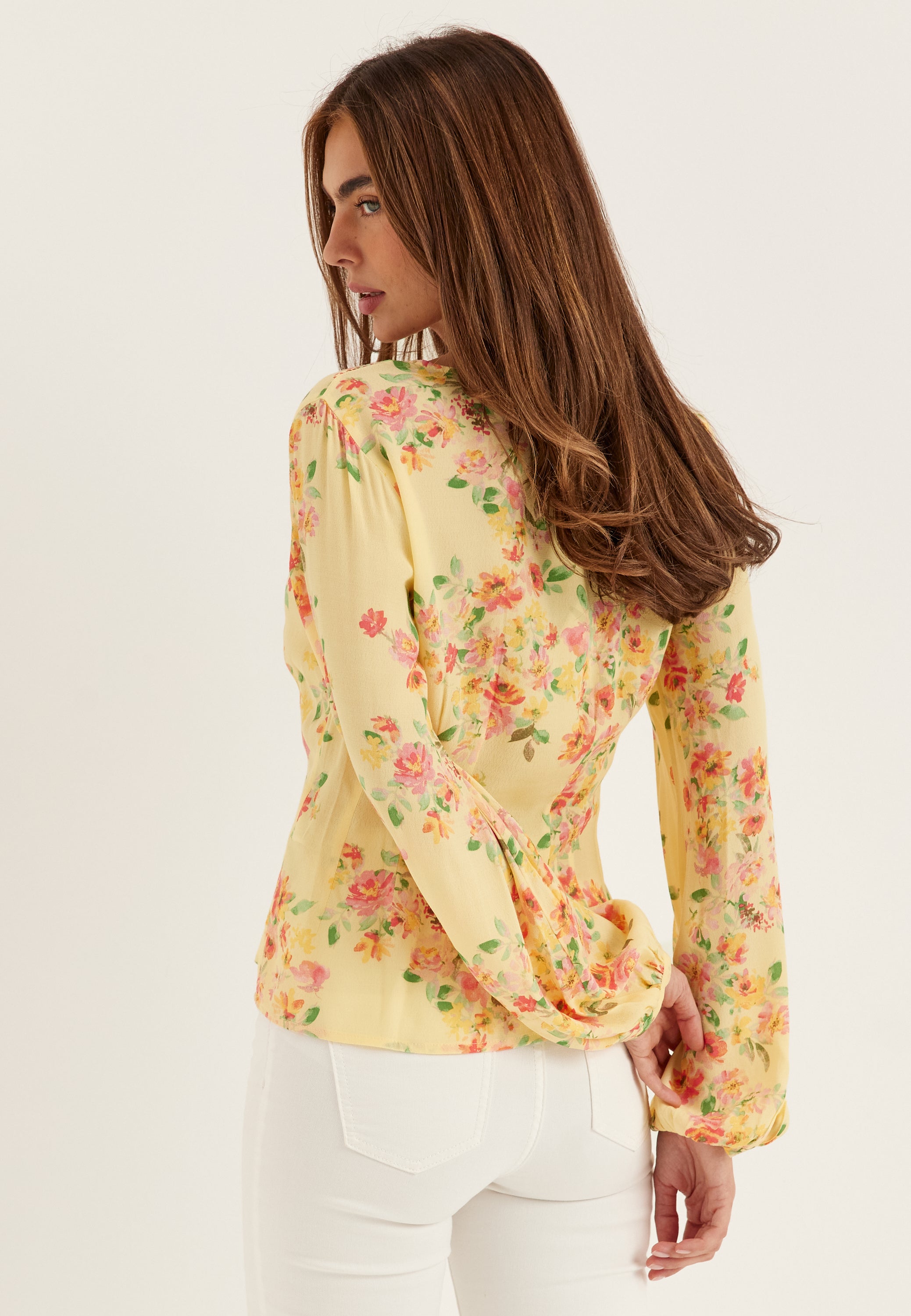 Den här blommiga blusen är en lätt långärmad topp som passar perfekt till vardags, med en mjuk gul botten och en ledig passform som funkar lika bra till jeans som till skräddade byxor. Det vävda tyget utan stretch ger ett fint fall, medan den lätt figurnära skärningen håller looken snygg utan att kännas för uppstyrd.